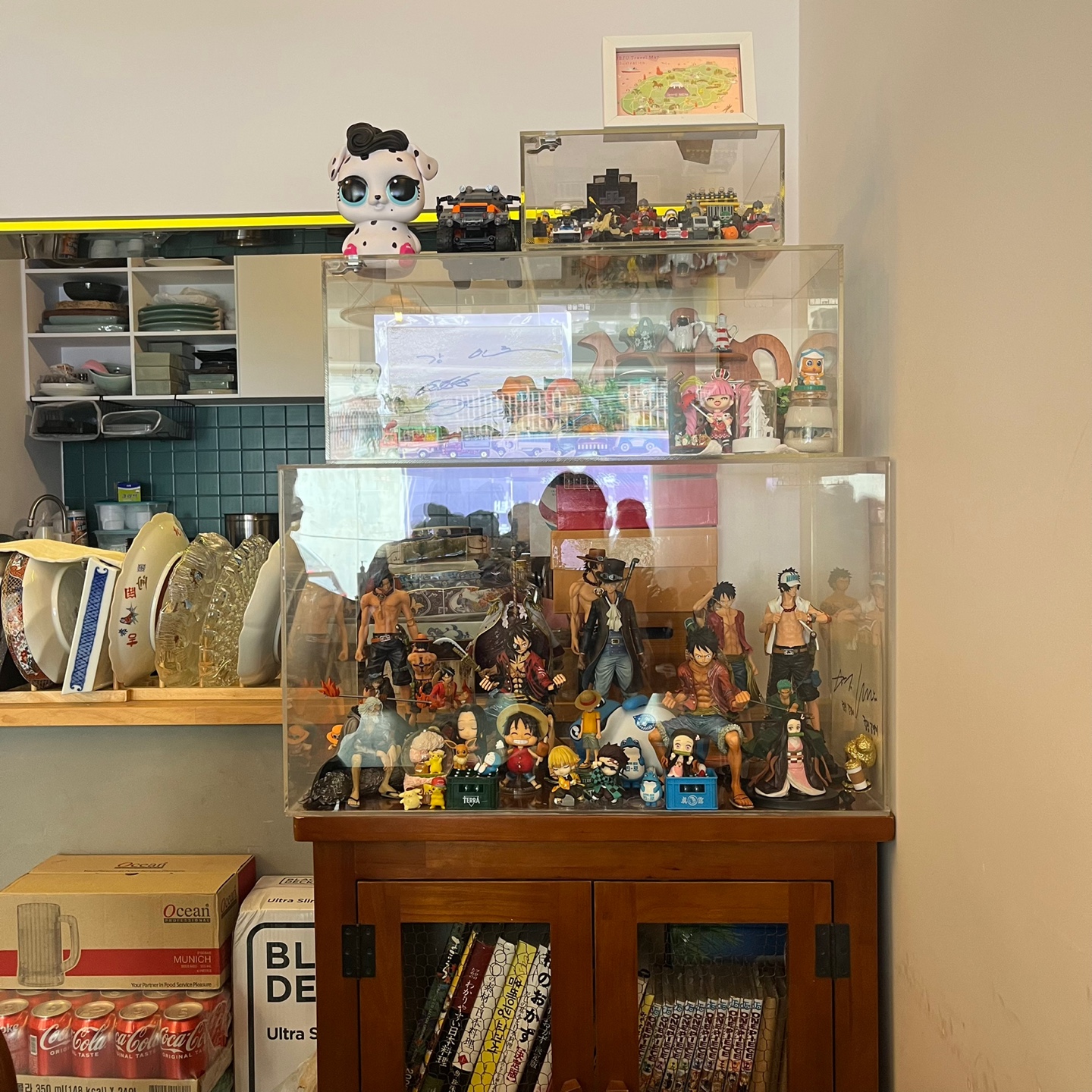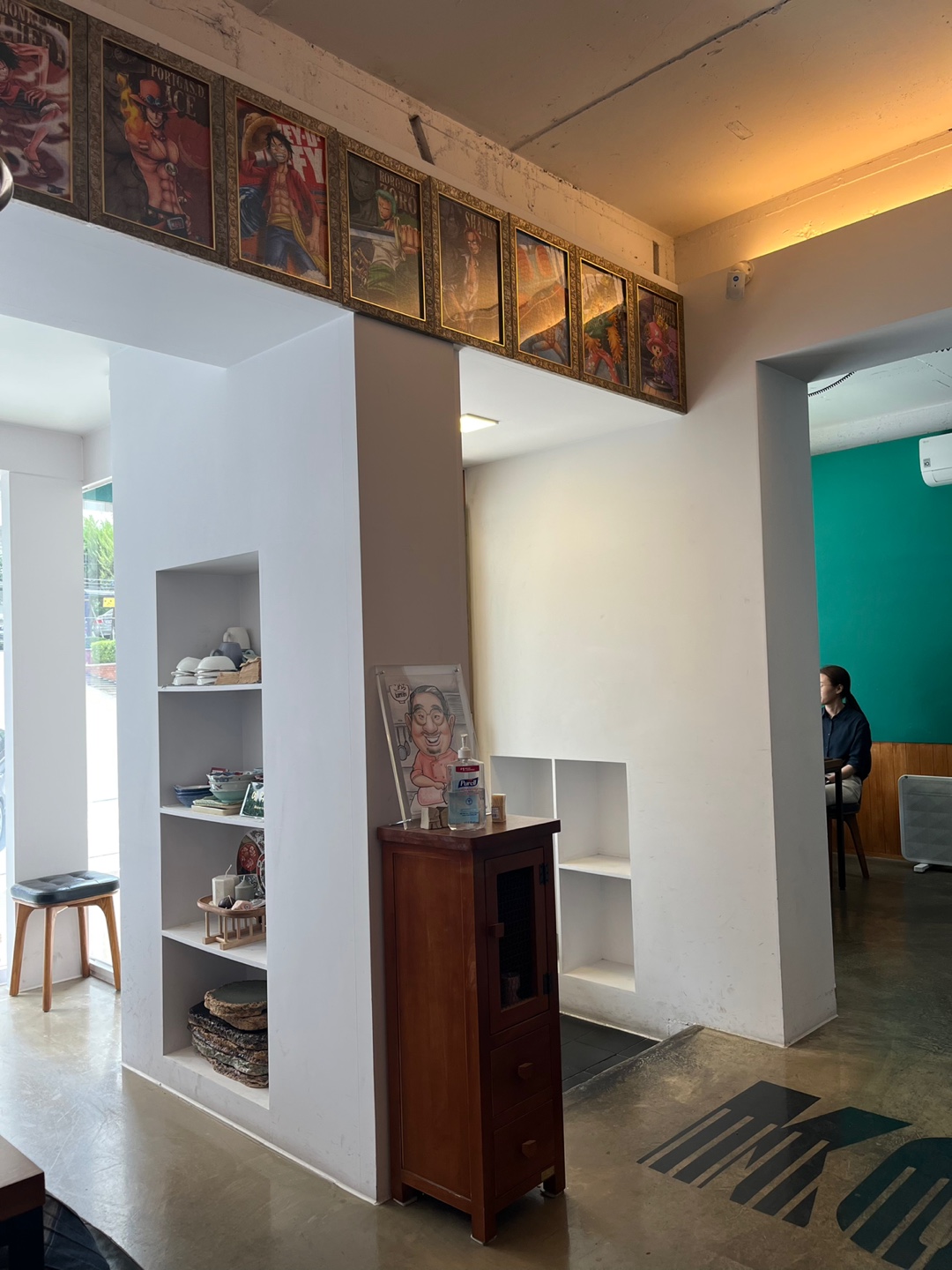 사실 테이블 같은 것들만 보면 여기가 어떤 것을 전문으로 하는 것인가 바로 알기는 쉽지 않지만 인테리어를 잘 둘러보면 일식 전문점인 것을 알 수 있는 요소들이 많이 있습니다. 위쪽에 걸린 원피스 캐릭터들과 각종 피규어들 그리고 한쪽에 정렬되어 있는 만화책을 보면 말이죠.