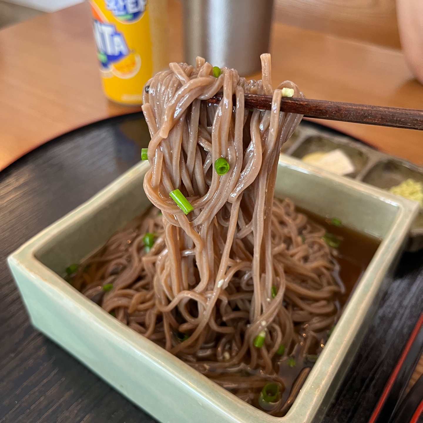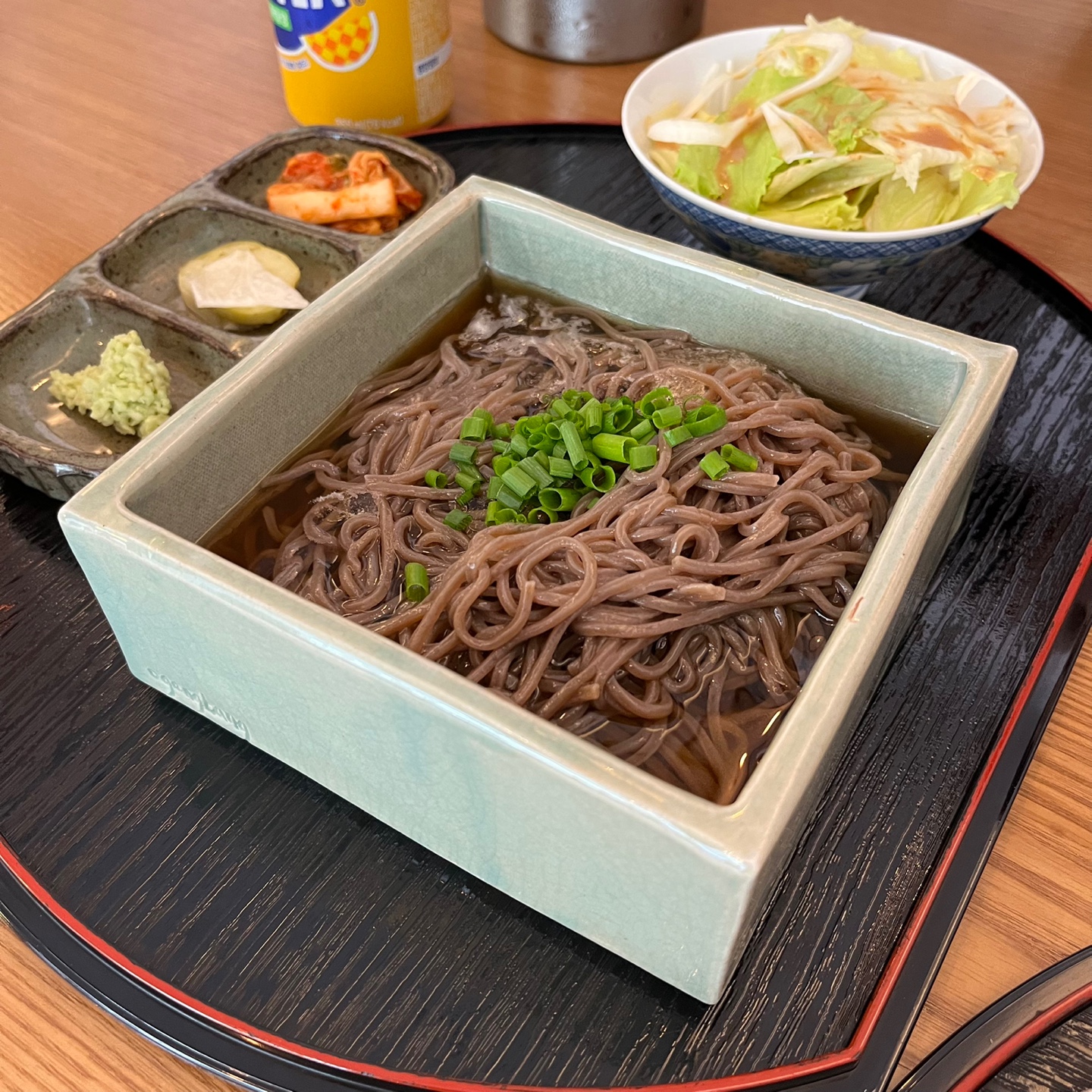 요즘 제가 빠져있는 냉모밀인데 참 정갈하게 나온다는 생각을 했습니다. 밑반찬으로는 역시 피클, 김치, 샐러드가 나오고 냉모밀에 넣을 생와사비가 함께 나오네요.
